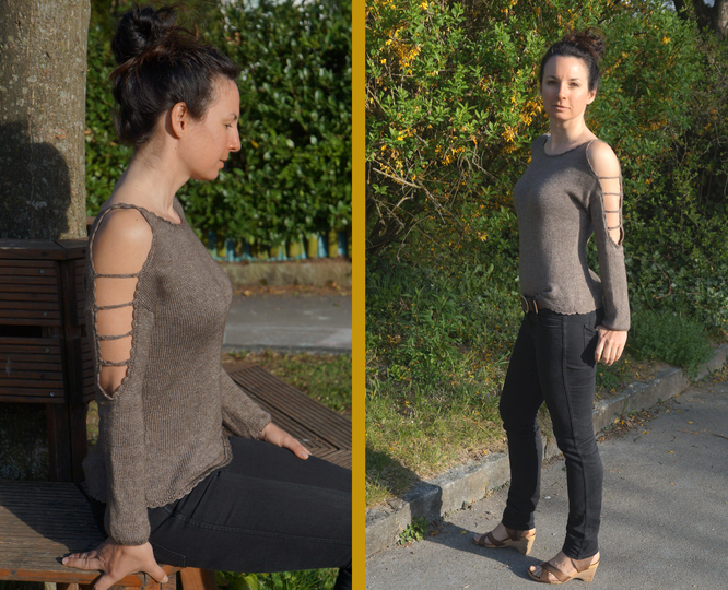 Dieser luftige Pullover Strick und Häkelpullover besticht durch die offenen Ärmel am Schulterbereich bis Ellenbogen. Um die lässige Form zu erreichen, sind die Arme leicht im Fledermausstil gearbeitet.