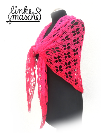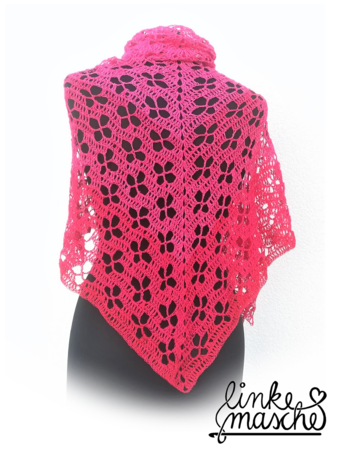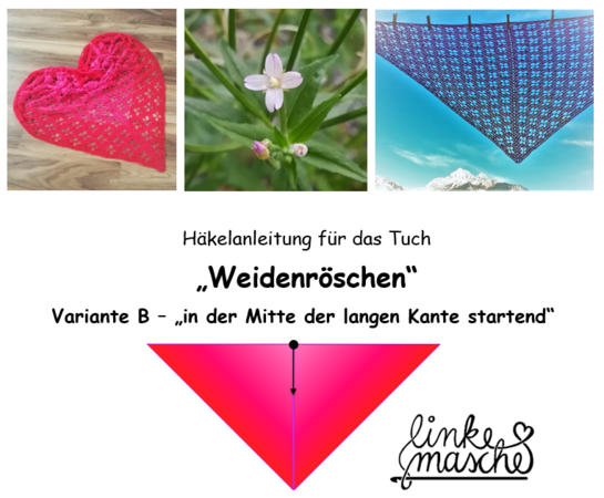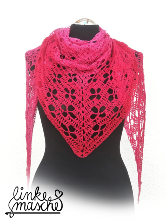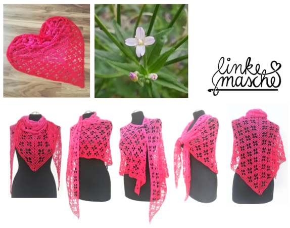 Die Anleitung zum Dreiecktuch "Weidenröschen" gibt es in 2 Varianten. Das Tuch dieser Variante B wird von der Mitte der langen Kante aus in Hin- und Rückreihen mit Zunahmen an Anfang, Mitte und Ende jeder Runde bis zur gewünschten Größe gehäkelt.