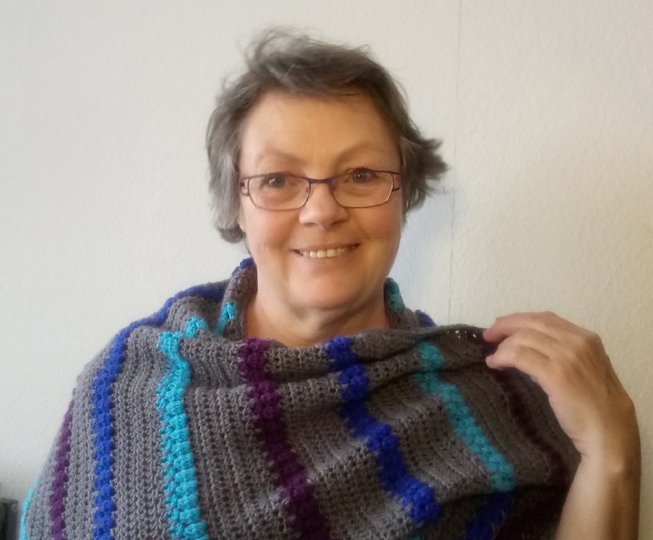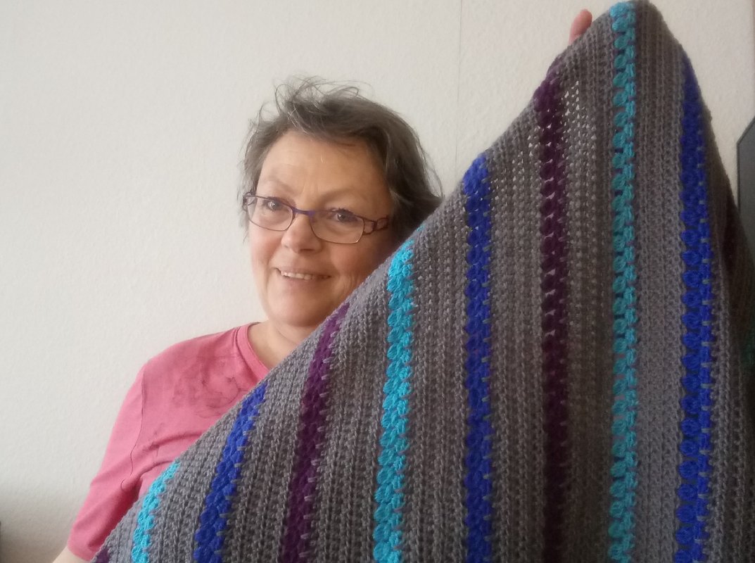 Die Grundfarbe ist Titangrau und mit 3 verschiedenfarbigen Streifen habe ich Abwechslung und Farbe in das Tuch gebracht. Das Garn, das zur Hälfte aus Merino- Wolle und Baumwolle besteht, wirkt bei jeder Wetterlage ausgleichend.