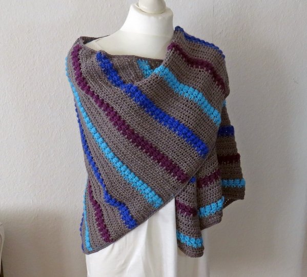 Da es asymmetrisch gehäkelt wird, ist jede Kante unterschiedlich lang und du kannst dein Tuch in vielen Variationen tragen.