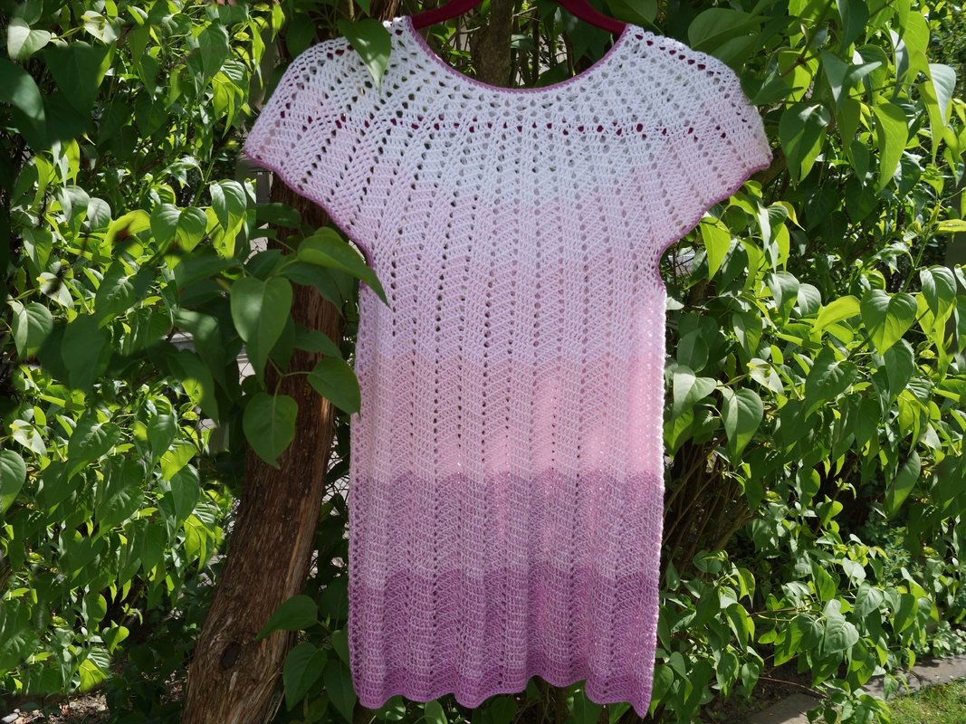 Die Wollmenge variiert je nach Größe des Kleides. Ich habe dieses Kleid für ein sechsjähriges Mädchen gehäkelt und habe insgesamt 200 g Wolle (Bobbel 3- fädig, 50% Baumwolle, 50% Polyacryl) verbraucht. Häkelnadel Nr.2,5