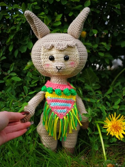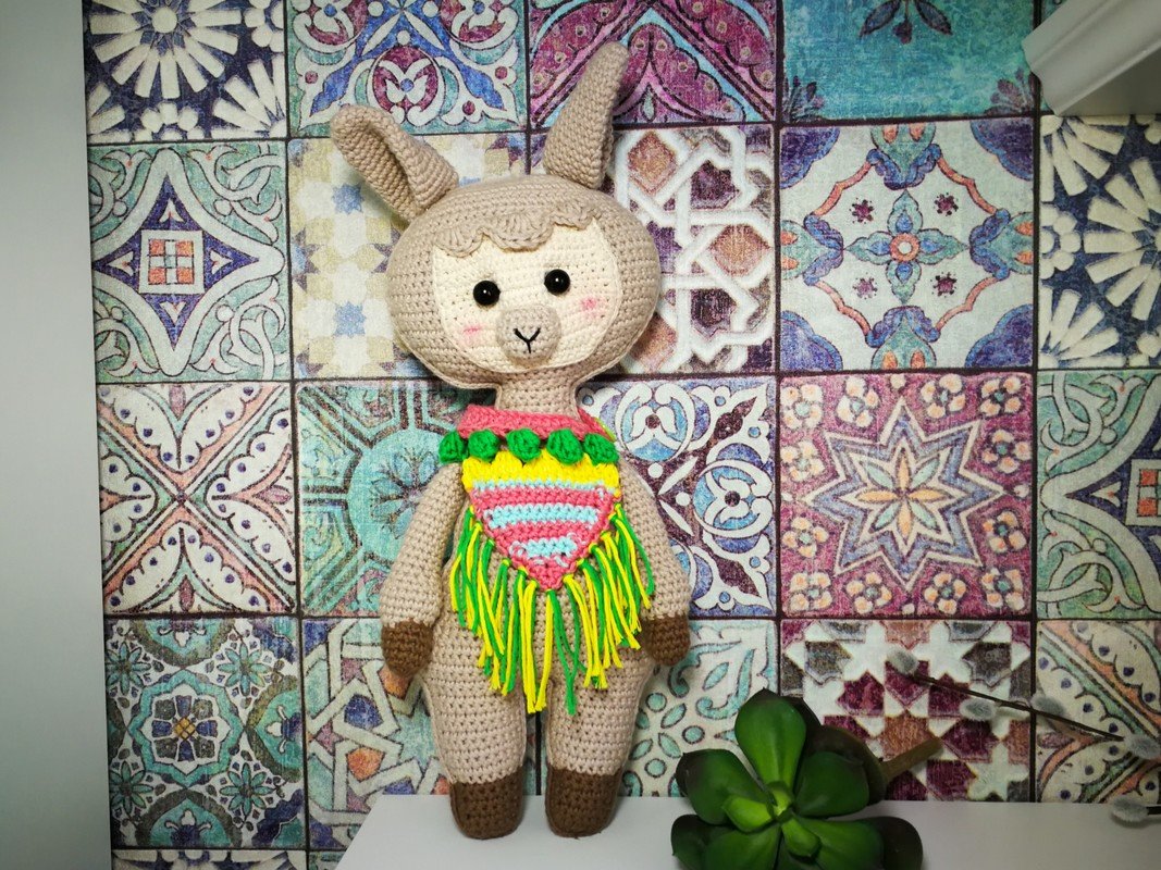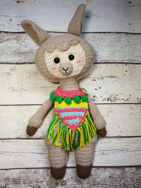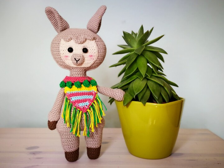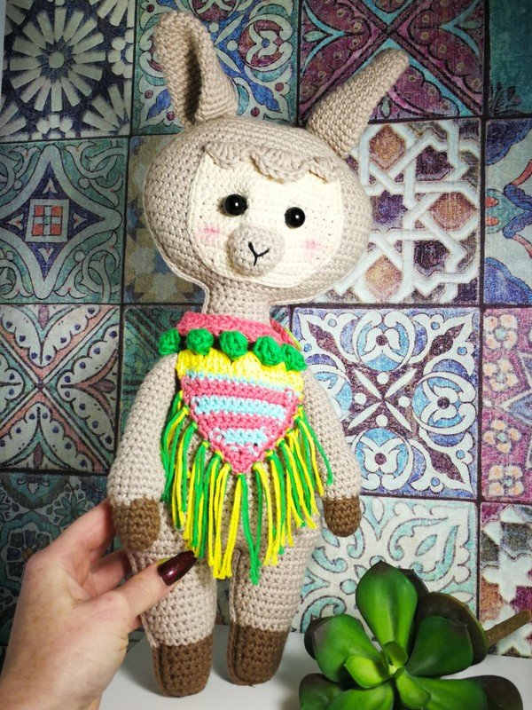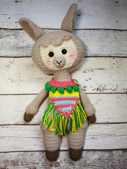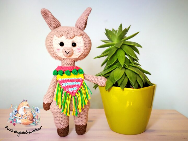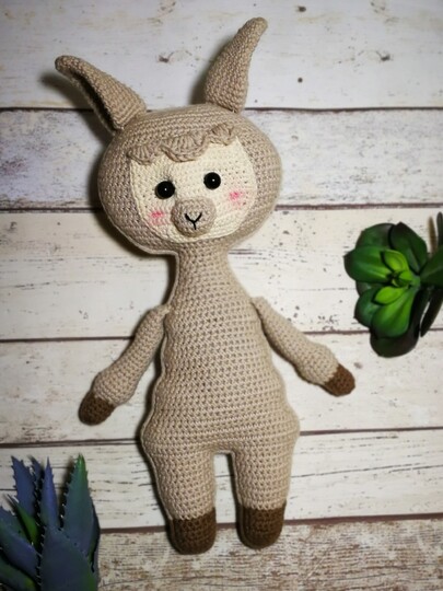 Das fertige Alpaka wird mit angegebenem Garn ca. 37 cm hoch.