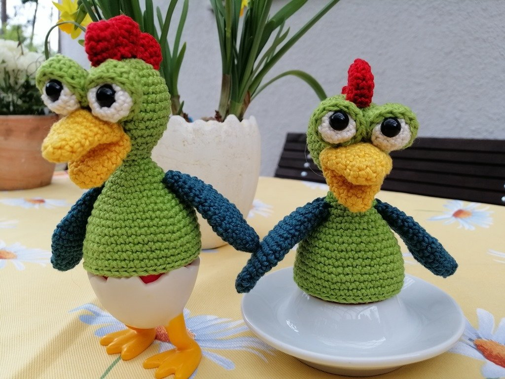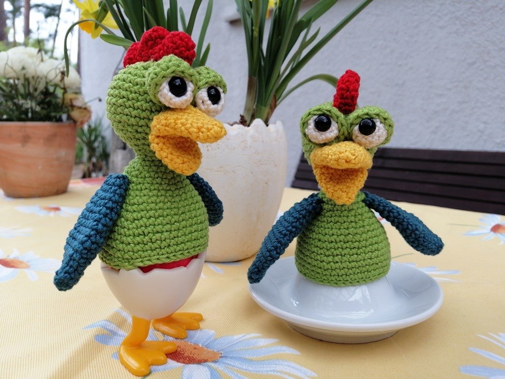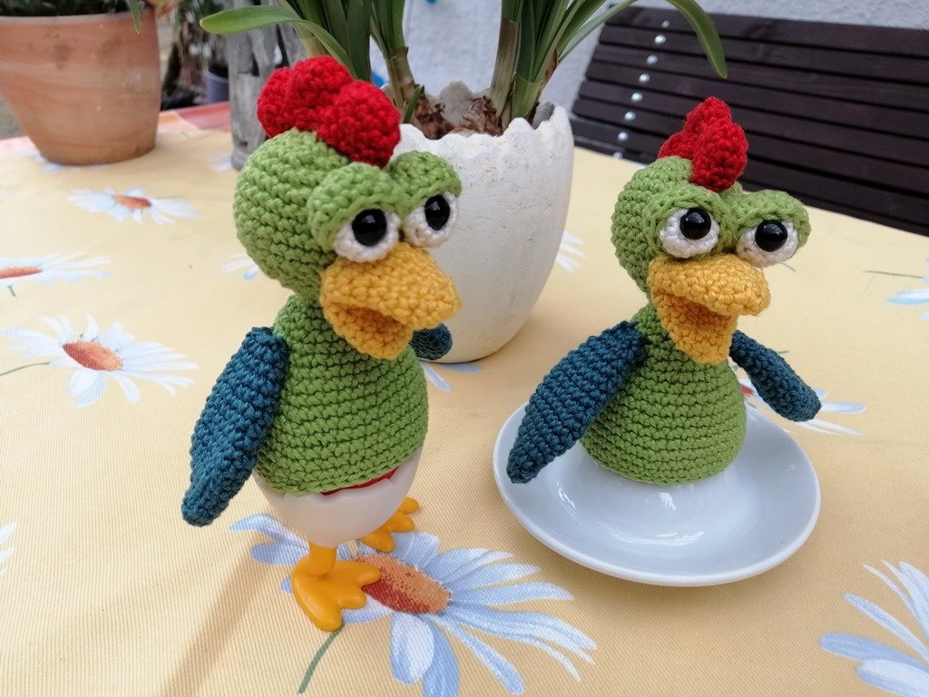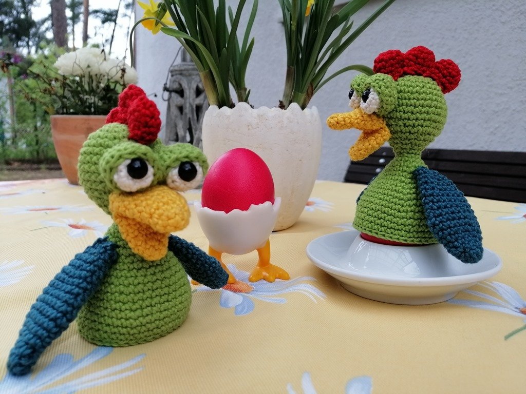 Passend zu meinem großes Gockel gibt es jetzt diese fröhlichen Eierwärmer. Sie bringen jeden Morgen gute Laune auf den Tisch und halten dazu noch eure Frühstückseier schön warm. :-)