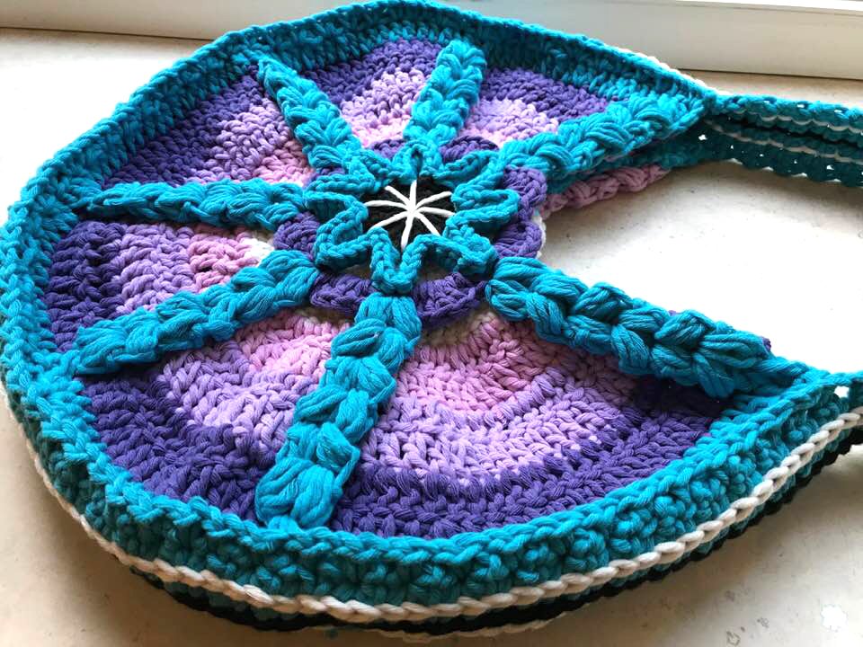 dieTasche wiegt fertig 380gr udn hat einen Durchmesser von c.40 cm.