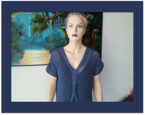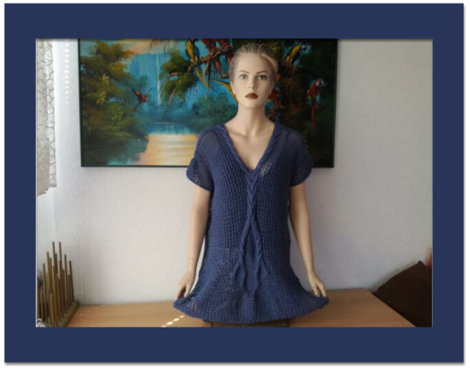 Es wird in einem Netzmuster gestrickt wobei im Vorderteil ein dekoratives Zopfmuster mit eingearbeitet wird.