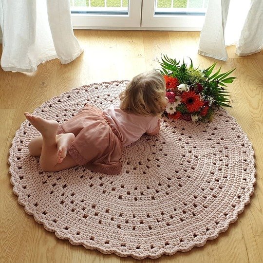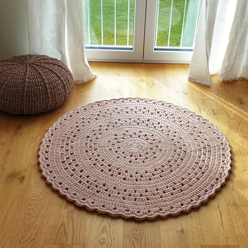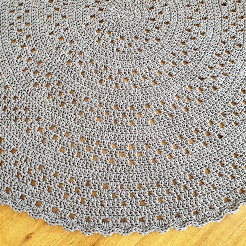 In der Anleitung ist es beschrieben, wie ein Teppich in der Größe 115 cm zu häkeln ist. Allerdings kann der Teppich abhängig vom Material und Häkelart größer oder kleiner ausfallen.