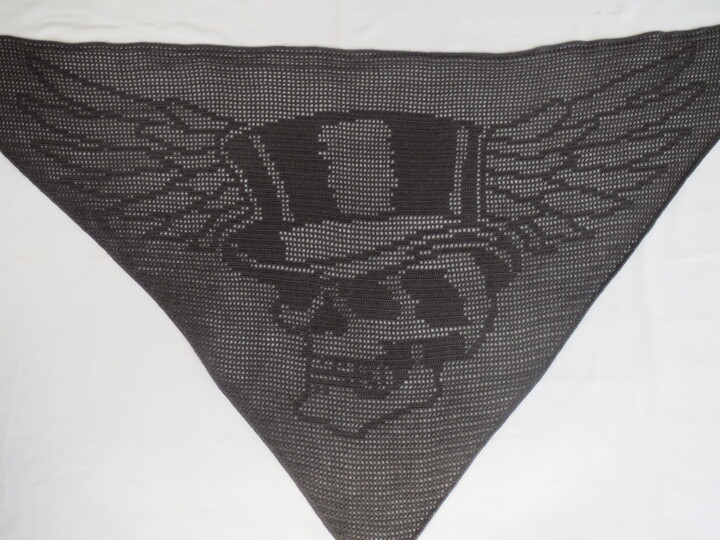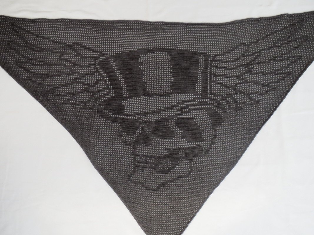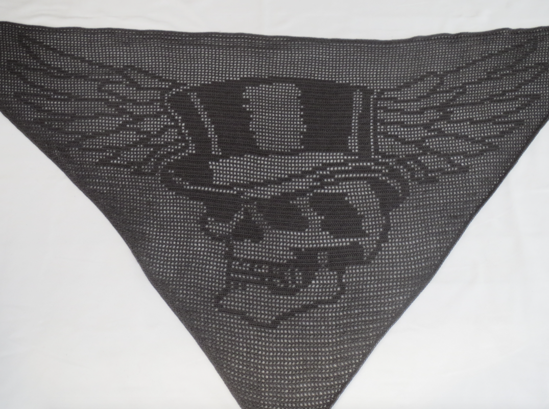 Totti ist ein in Filethäkelei gehäkeltes Dreieckstuch mit Totenkopf Motiv.