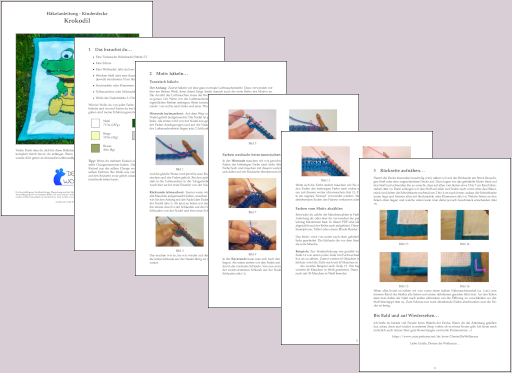 Die Anleitung enthält zusätzlich eine PDF Datei mit der genau abgezählten Maschenanzahl jeder Farbe pro Reihe. Diese Datei kann auf den eBook-Reader oder das Smartphone geladen werden um auch unterwegs bequem häkeln zu können. :)