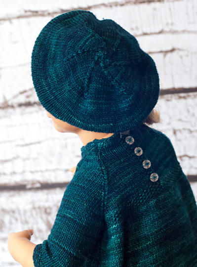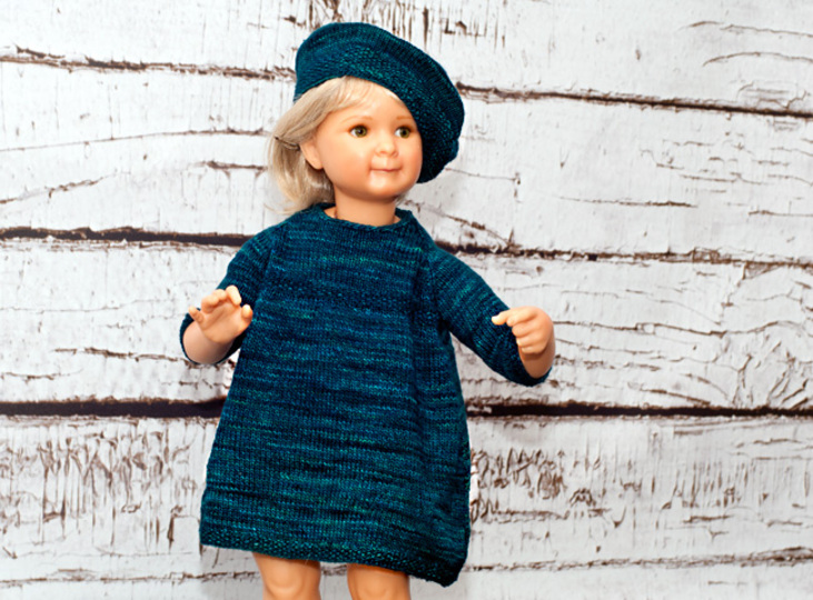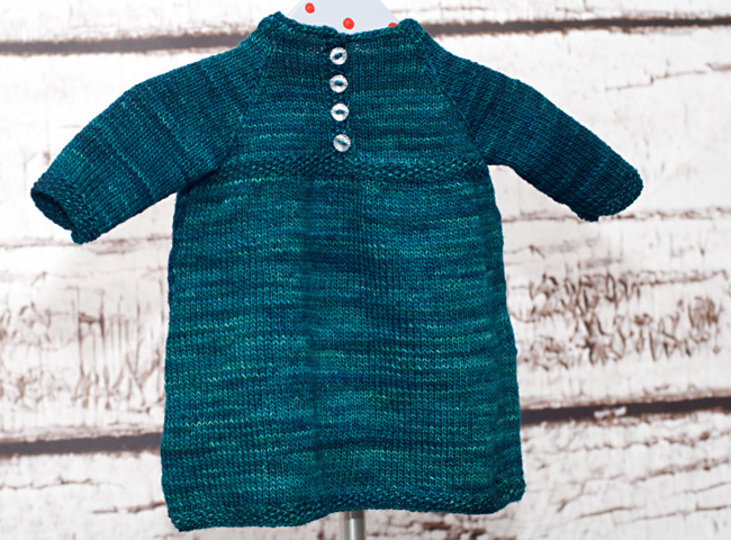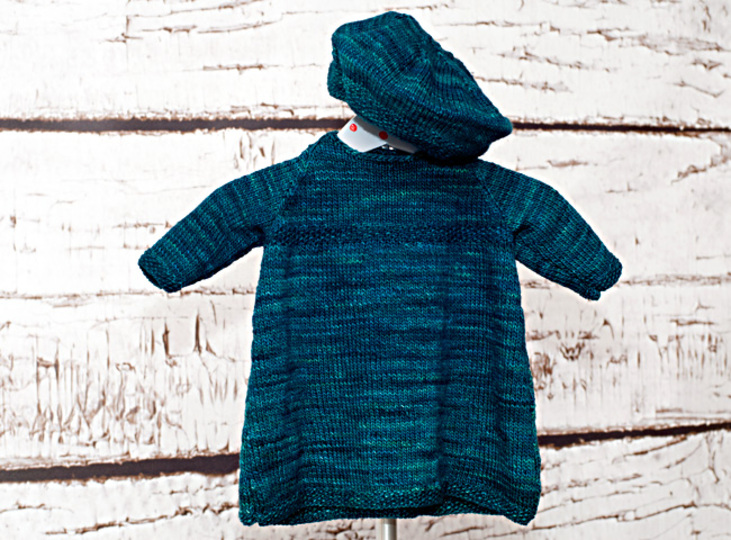 Strickanleitung für ein süßes Babyset , bestehend aus einem Kleid mit Raglanärmeln und passender Baskenmütze. Das Kleid wird hinten geknöpft, sodass es leicht über den Kopf gezogen werden kann.