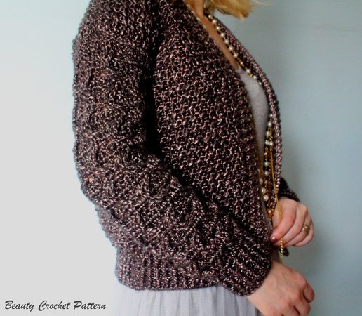 Rock'n'Roll Jacke ist eine offene Häkeln jacke mit Fashion-Look. Ärmel mit ihrer Textur ähneln einer Wabe.