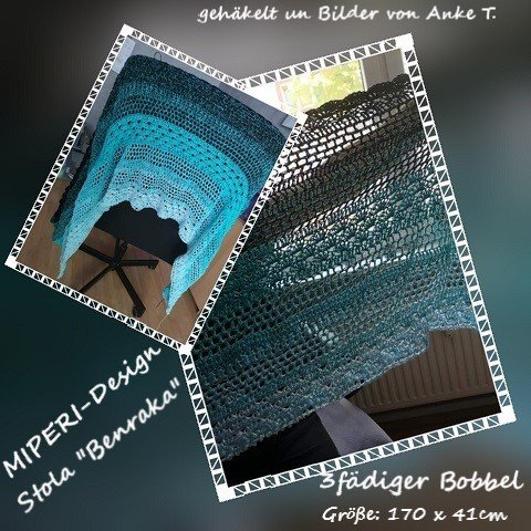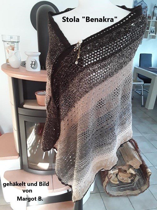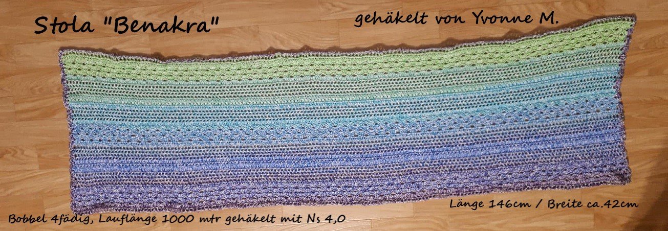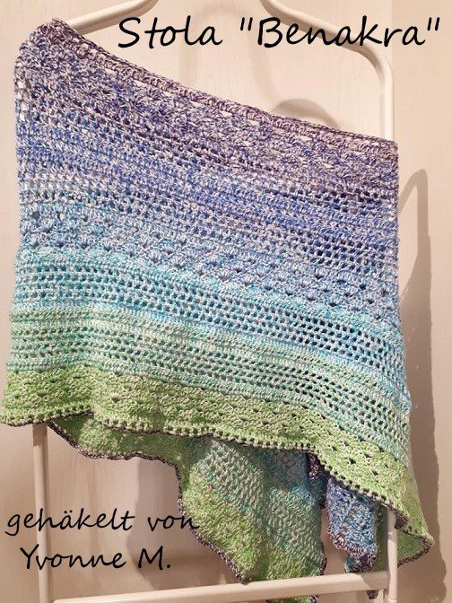 Die Häkelanleitung für die "Benakra", ist eine einzigartige Stola mit Mustermix geworden. Mein Prototyp ist 162cm lang und 48cm breit.