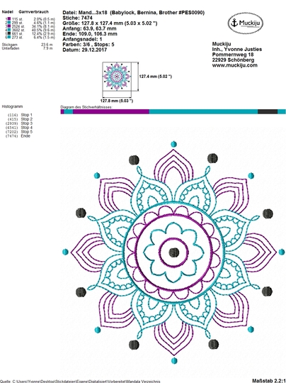 Sollte Ihre Stickmaschine eine Stichzahlbegrenzung haben, prüfen Sie bitte erst ob Sie die Anzahl der Stiche meiner Motive verarbeiten können.