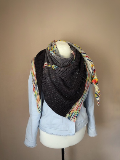Ich spanne meine Tücher sehr stark, deswegen hat mein Magnifica Dreieckstuch eine Größe von 230cm Breite und 120cm zum Zipfel runter. Die Größe deines fertigen Tuches hat mit deiner Strickfestigkeit und auch deinem Garn zu tun.