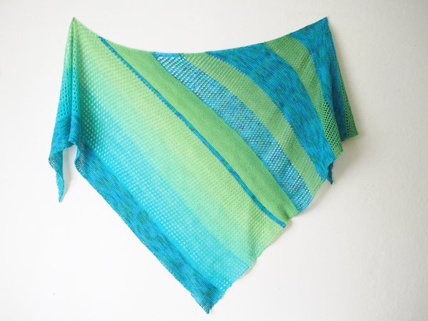 Diese Anleitung besteht aus 3 Mustern die in vorgegebener Reihenfolge gestrickt werden. Keine einzige linke Masche kommt zum Einsatz. Aus zwei Knäueln Garn machst du dir dein persönliches Lieblingsstück – luftig leicht und doch schön groß zum Einwickeln. Perfekt für jede Gelegenheit!