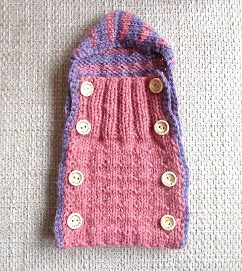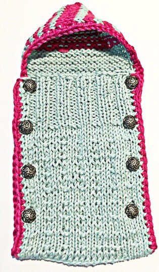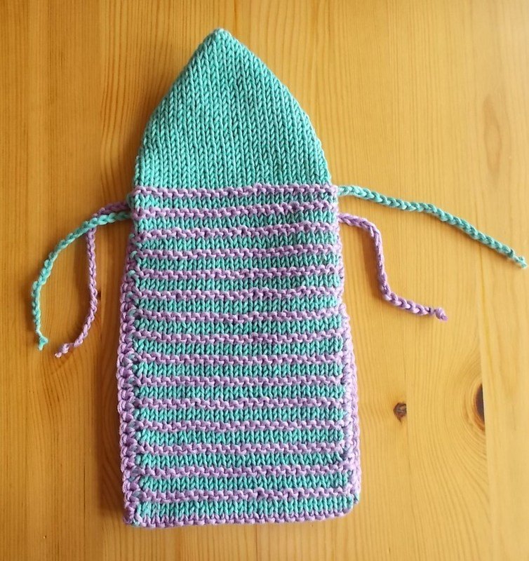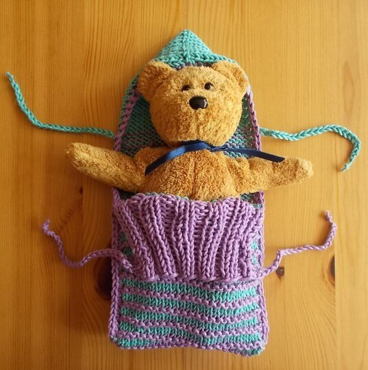 Die Maße des Schlafsacks lassen sich auch für andere Größen abwandeln. Die einfachste Möglichkeit ist, dickere oder dünnere Nadeln zu verwenden oder eine andere Wollstärke. Die Breite und auch die Länge des Schlafsacks lassen sich ganz einfach erweitern durch mehr Maschen bzw. Reihen.