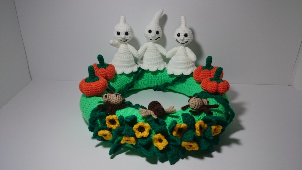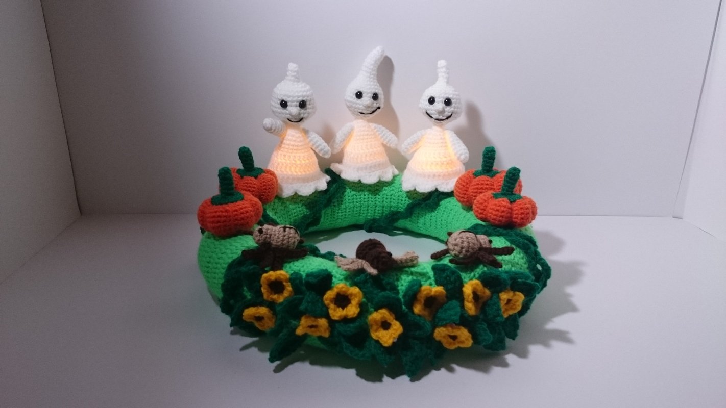 Wenn Du diese Wolle verwendest, wird der Kranz ca. 28cm im Durchmesser und die Gespenster ca. 12 - 14cm groß!
