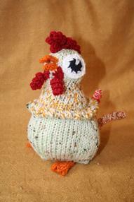 Körper, Füße und die Kehllappen werden gestrickt, Augen, Kamm, Schnabel und die Schwanzfedern gehäkelt.