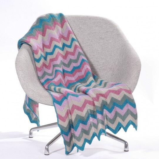 Eine tolle Decke aus Simple Wool. Die Streifen werden in einer zufälligen Farbreihenfolge gestrickt, um der Decke ein spannendes und willkürliches Aussehen zu verleihen.
