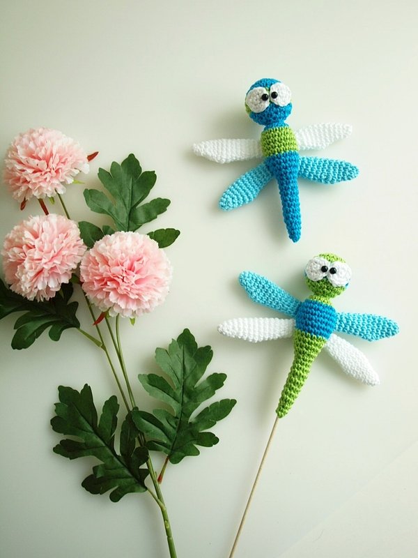 Die fertigen Libelle ist (gehäkelt mit Häkelnadel 2.5 und Schachenmayr Catania) ca. 15 cm groß und 15 cm breit.