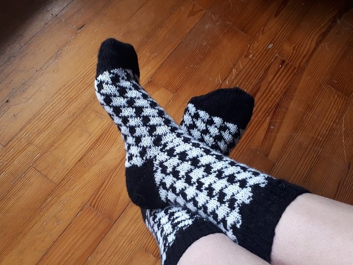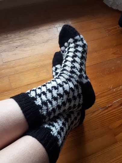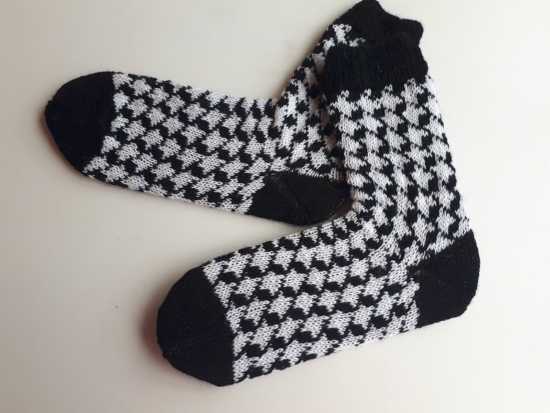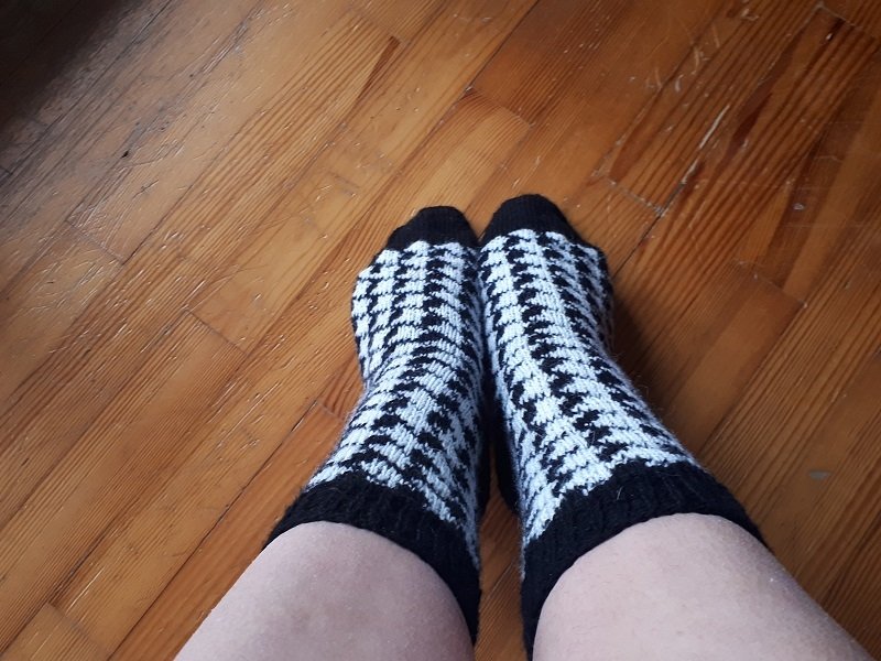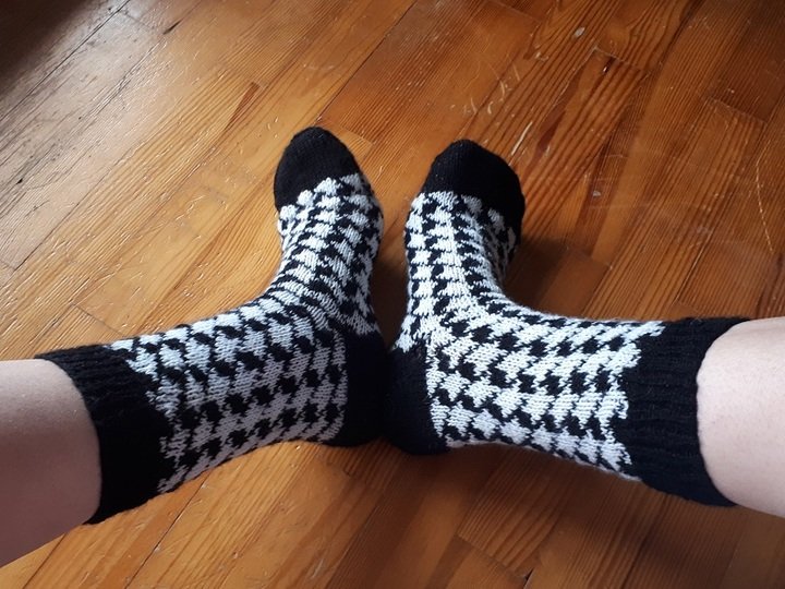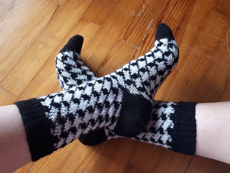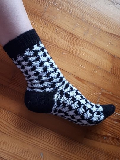 Der Socken wird mit der Bumerangferse gestrickt, welche ausführlich und mit Bildern erklärt wird.