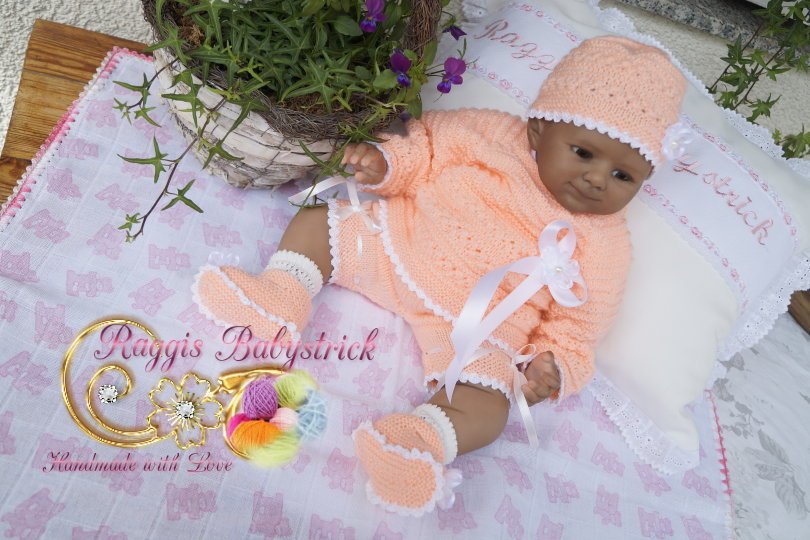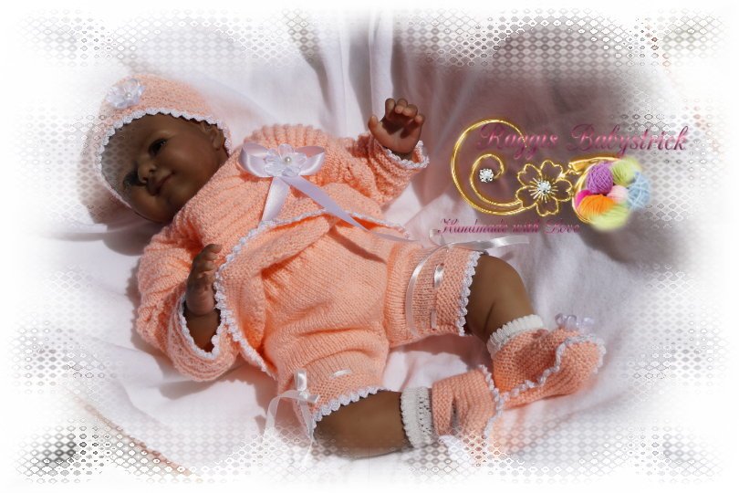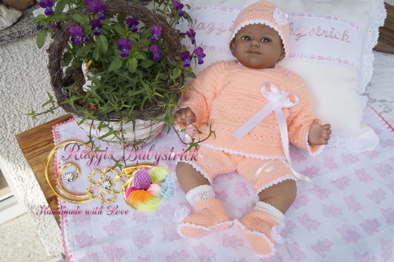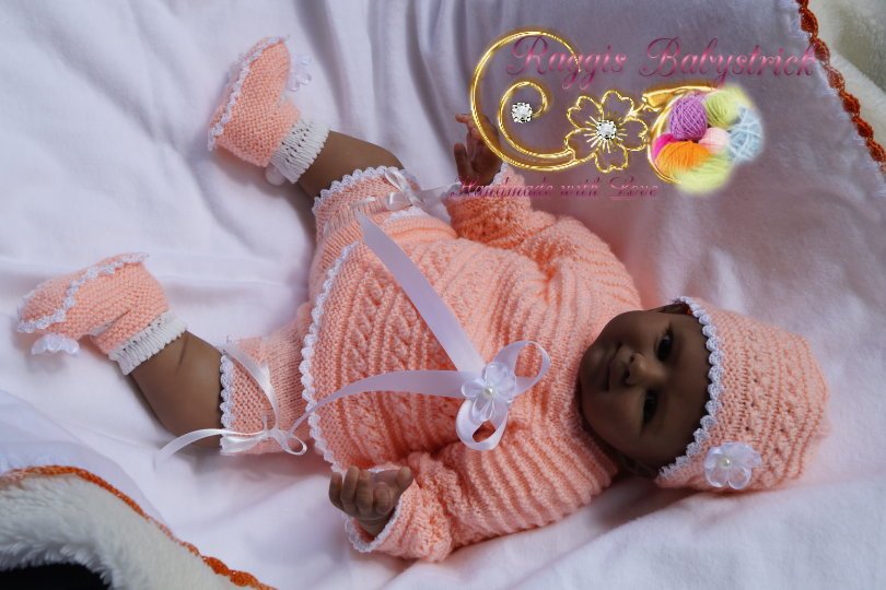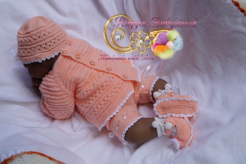 Strickanleitung für ein wunderschönes Set, 4-teilig für Babys & Reborns, Gr. 50 Das Set ist aus Babysoftwolle Nd. - Nr. 3 gestrickt. Die Anleitung ist sehr genau beschrieben und mit vielen Fotos. Auch ohne viel Strickerfahrung kannst Du mit dieser Schritt – für – Schritt – Anleitung dieses Set leicht nacharbeiten.