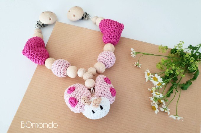Die liebevoll gestaltete Kinderwagenkette bietet den Kleinen viel Freude beim Erkunden ihrer neuen Welt. In der Mitte der Wagenkette baumelt ein niedlicher Marienkäfer.