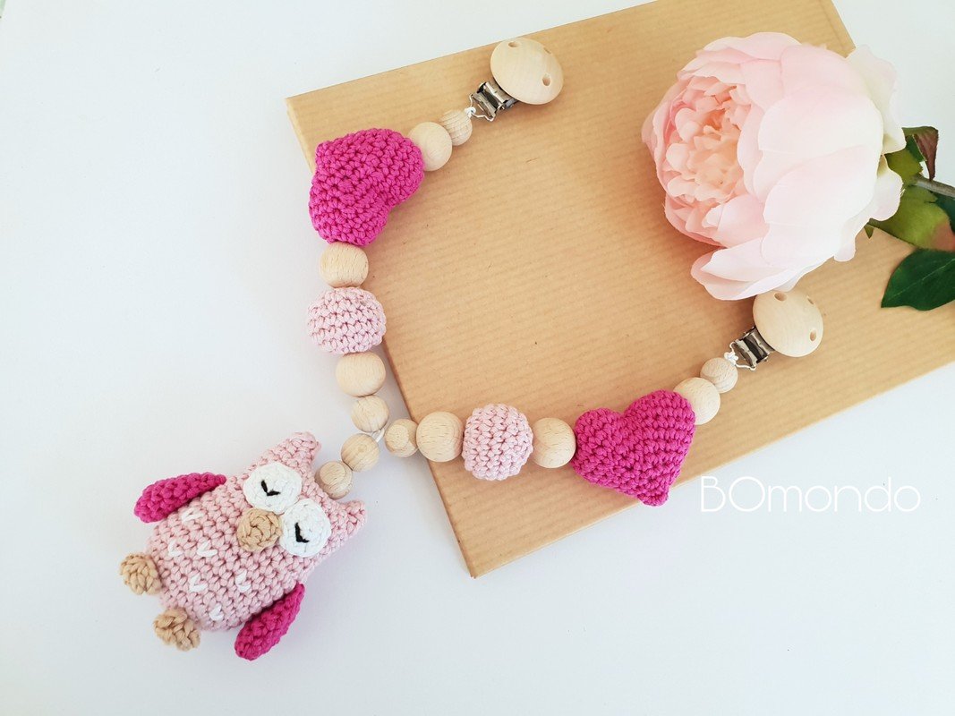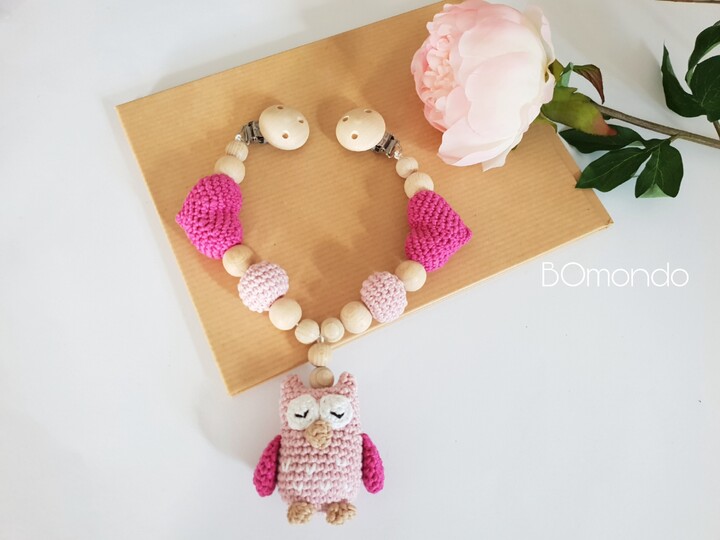 Die liebevoll gestaltete Kinderwagenkette bietet den Kleinen viel Freude beim Erkunden ihrer neuen Welt. In der Mitte der Wagenkette baumelt eine niedliche Eule.