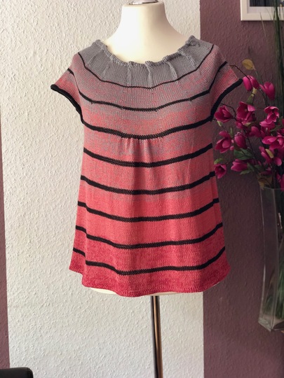 Diese Tunika wird in Runden von oben nach unten gestrickt. Dabei werden ausschließlich rechte Maschen gestrickt. Oben wird weit begonnen, damit zum Schluss schöne Falten entstehen.