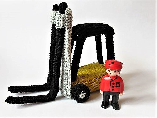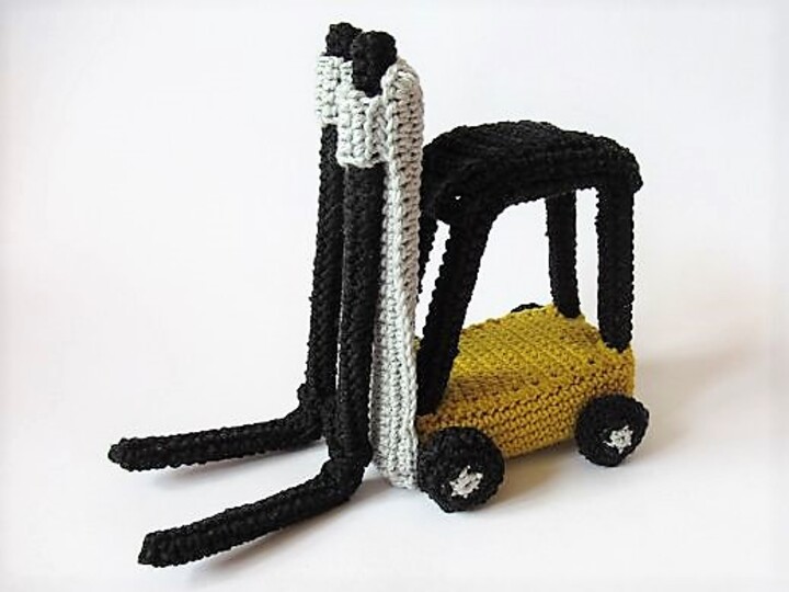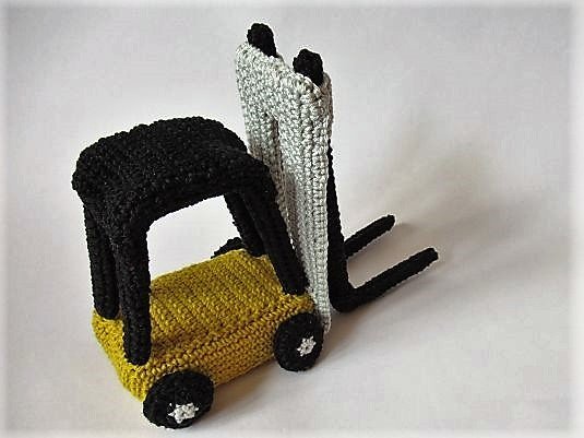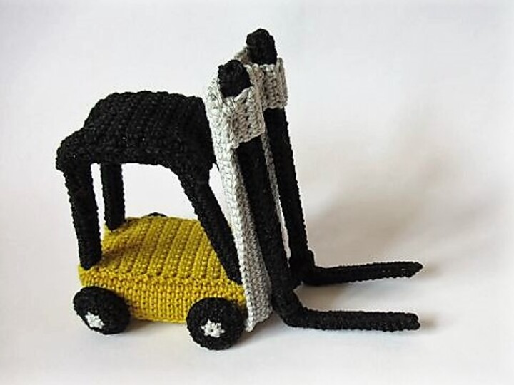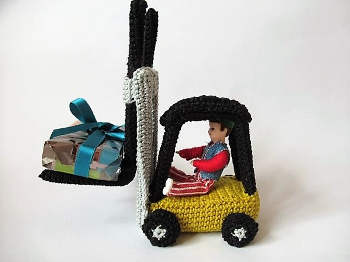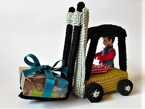 Für alle Baumarkt-Fans ist dies das richtige Geschenk: ein kleiner gehäkelter Gabelstapler, bei dem man die Gabeln auch in der Höhe verstellen kann. Du kannst ihn als Dekorationsobjekt oder Spielzeug verwenden. Er ist auch eine originelle Geschenkverpackung: Lege ein kleines Päckchen auf die Gabeln und lass es von dem Gabelstapler transportieren.