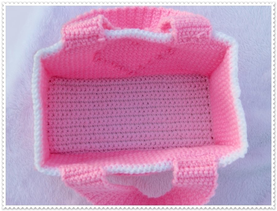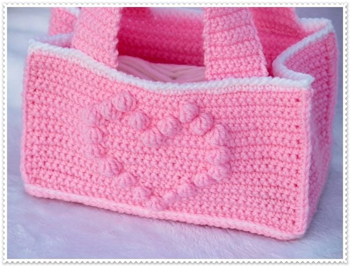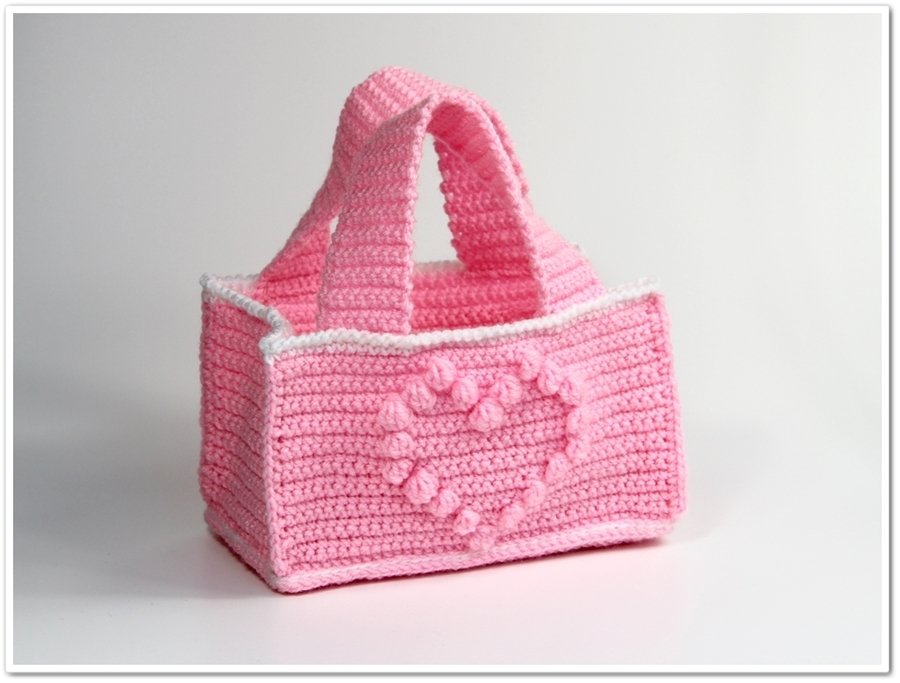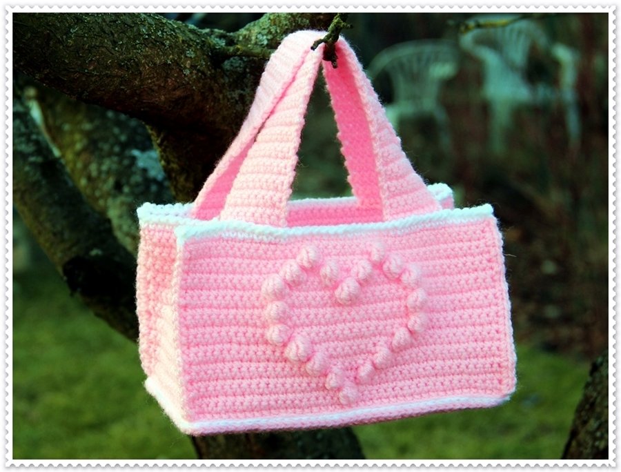 Welches Mädchen hätte nicht gern so eine kleine hübsche Lieblingstasche? Sie ist mit einer Größe von 21 x 11 x 22 cm ideal für Kinder zum Spielen und Aufbewahren kleiner Schätze. Auf der Rückseite gibt es eine Fach für Extras und der doppelte Sandwichboden ist schön stabil. Das eingehäkelte Herz sagt, ich hab dich lieb.