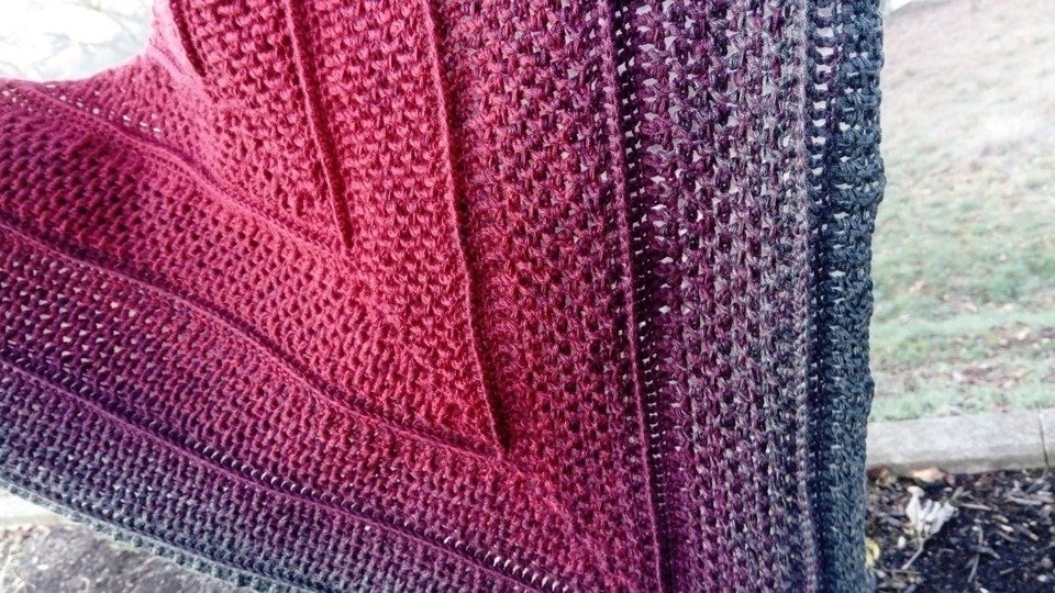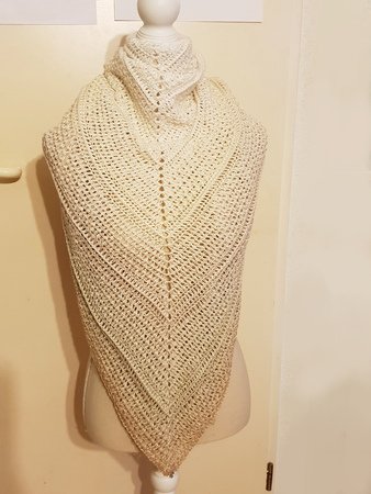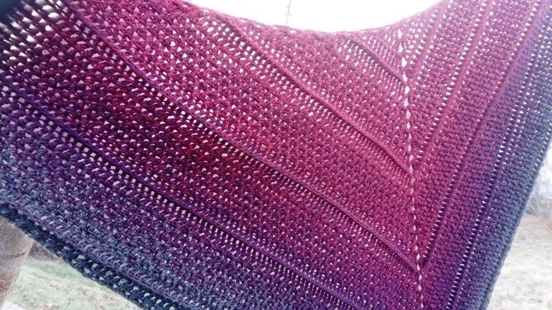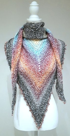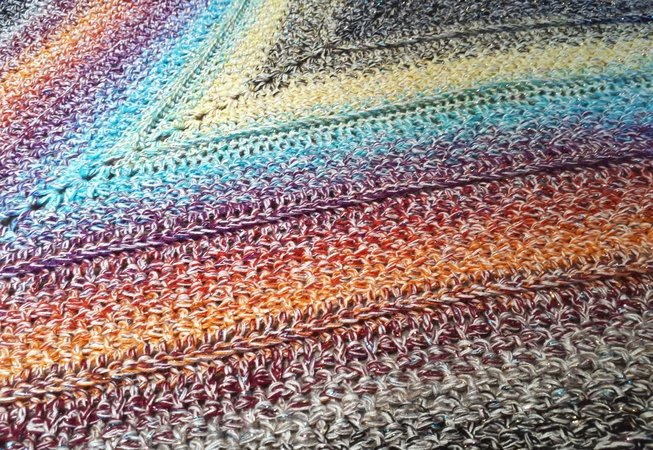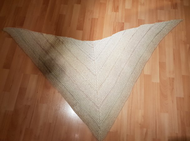 Die Größe des Tuchs variiert je nach Lauflänge, verwendeter Wolle und persönlichem Häkelverhalten (fest oder locker). Die Tücher der Testhäkler wurden alle bei 1200-1500m 4 Fädig zwischen 180 und 200m breit, also schön als Hals- oder Schultertuch.