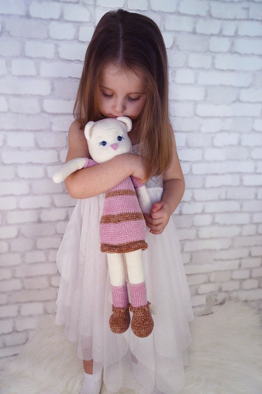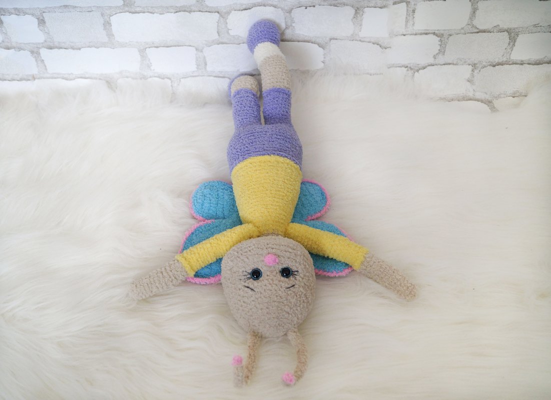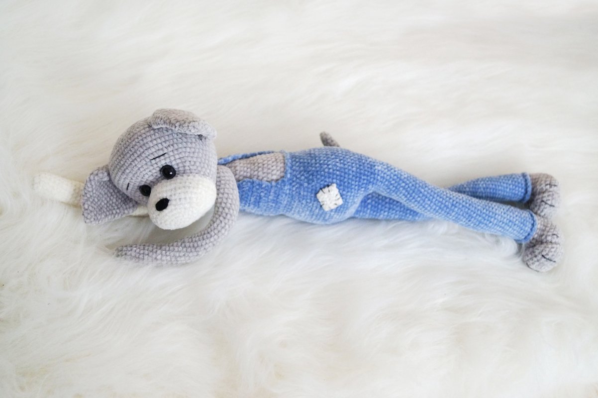 Material:Häkelnadel Nr. 2,75 und 2,5, Häkelgarn Katia Velvet Fine (160m / 50g-Knäuel), Häkelandel Nr.3, versch. Farben Alize Baby Softy ca. 110g , Nähnadel, Füllwatte