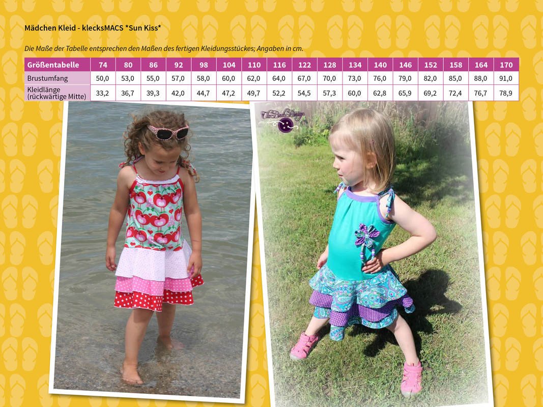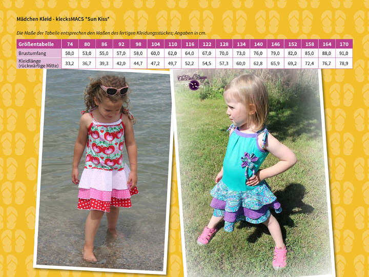 Das Mädchenkleid "Sun Kiss" ist ein locker, luftiges Sommerkleid und eher bequem geschnitten. Die zu verwendende Größe wird nach dem Brustumfang des Kindes bestimmt. Deshalb bitte vor Beginn Maß nehmen.