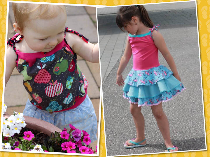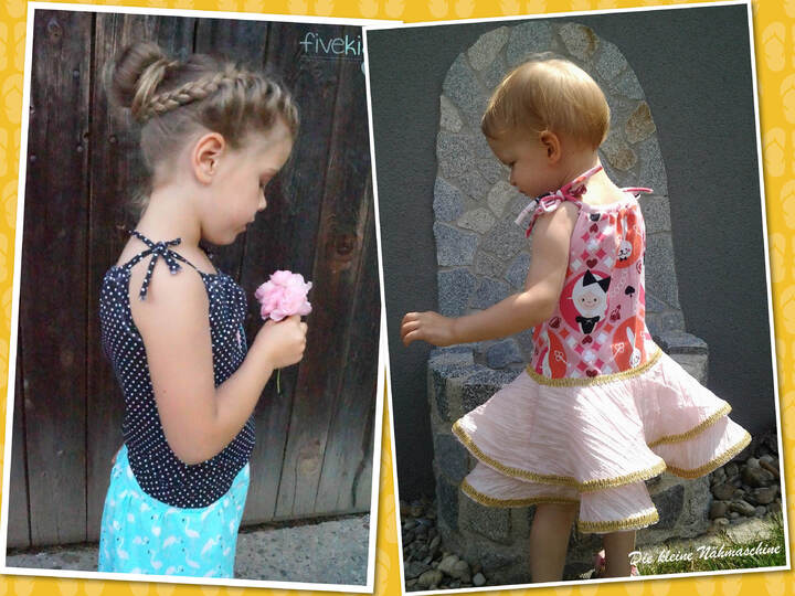 klecksMACS "Sun Kiss" ist ein sommerliches Kleid aus einer Kombination von Jersey und Webware. Natürlich kann es auch komplett aus Jersey ruckzuck genäht werden. Beim Oberteil besteht die Möglichkeit, Spaghetti-Träger durch den genähten Tunnel zu ziehen oder die geflochtenen Träger an den Armausschnitten oder an der Oberkante des Oberteils zu fixieren. Auf alle Fälle so oder so ein Hingucker! Durch die Weite der Rockstufen ist es ein ideales Drehkleid für kleine und große Tanzmäuse. Das Ober- sowie das Rockteil können auch ohne weiteres mit entsprechenden Bündchen einzeln getragen werden. Somit hat man mit einem Schnitt drei neue Kleidungsstücke.