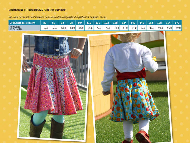 Der klecksMACS "Endless Summer Rock ist weit geschnitten und bietet mit seiner weit schwingenden Form viel Bewegungsfreiheit. Die Taillenweite lässt sich mit dem Gummizug auf die benötigte Weite anpassen. Die zu verwendete Größe wird nach der Hüftweite des Kindes bestimmt. Bitte vor Beginn Maß nehmen. Die Maße der Tabelle entsprechen den Maßen des fertigen Kleidungsstücks, ohne Berücksichtigung der Länge des Einziehgummis, da diese je nach Taillenweite des Kindes unterschiedlich ist.