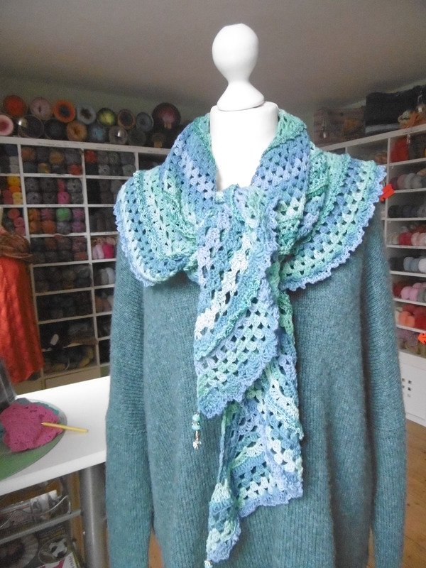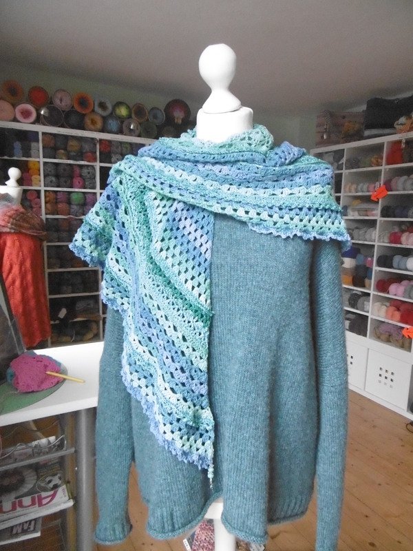 Man sollte aber Grundkenntnisse im Häkeln haben. Durch die Form des Tuches läßt es sich wunderbar um die Schultern schmiegen.