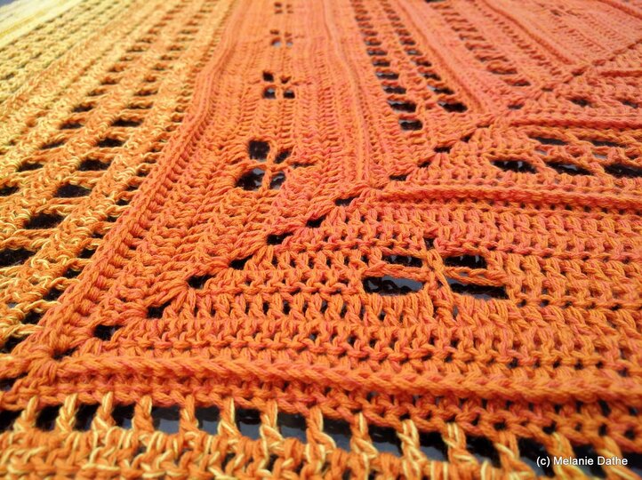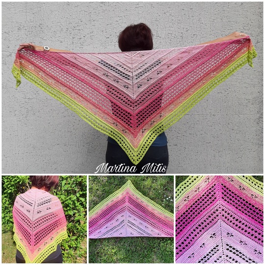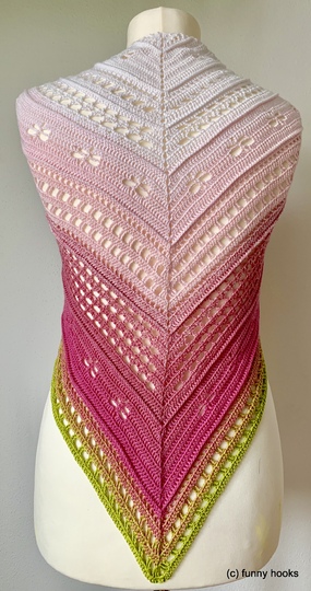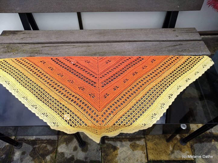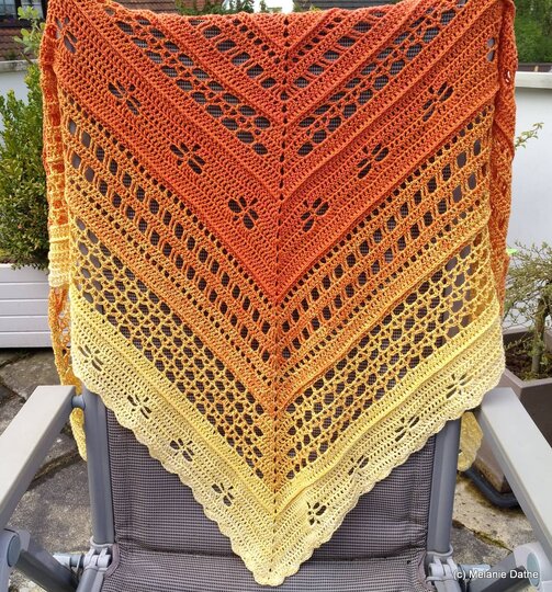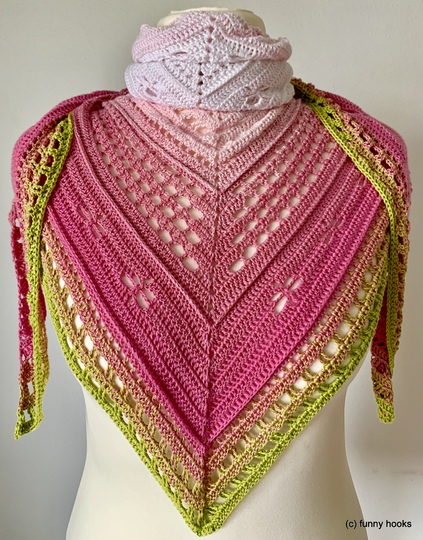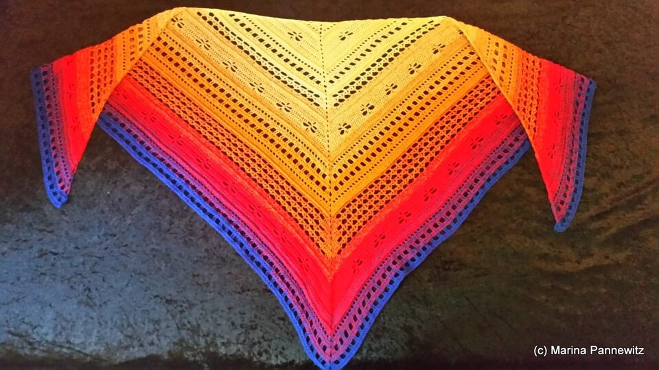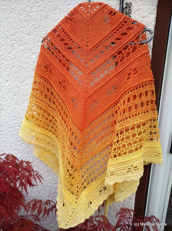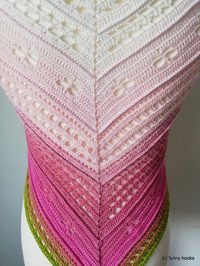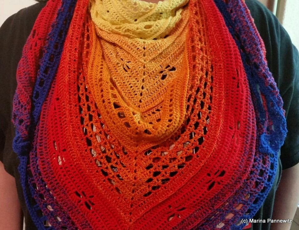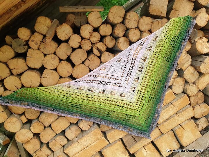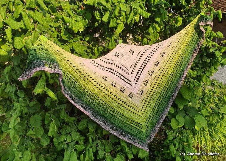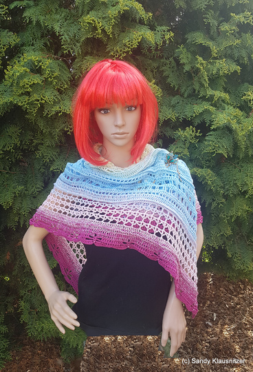 Das Tuch kann so groß gearbeitet werden wie gewünscht, ich empfehle allerdings min. 1000 m Farbverlaufsgarn oder auch jedes andere schöne Garn.