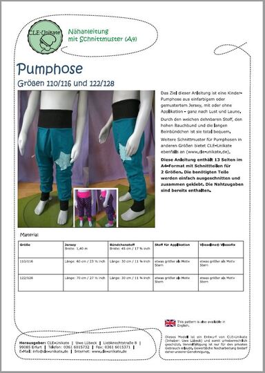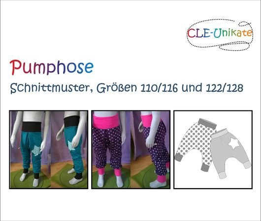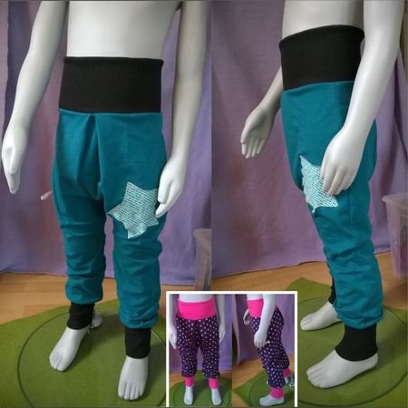 Das Ziel dieser Anleitung ist eine Kinder-Pumphose aus einfarbigem oder gemustertem Jersey, mit oder ohne Applikation - ganz nach Lust und Laune. Durch den weichen dehnbaren Stoff, dem hohen Bauchbund und den langen Beinbündchen ist sie total bequem.