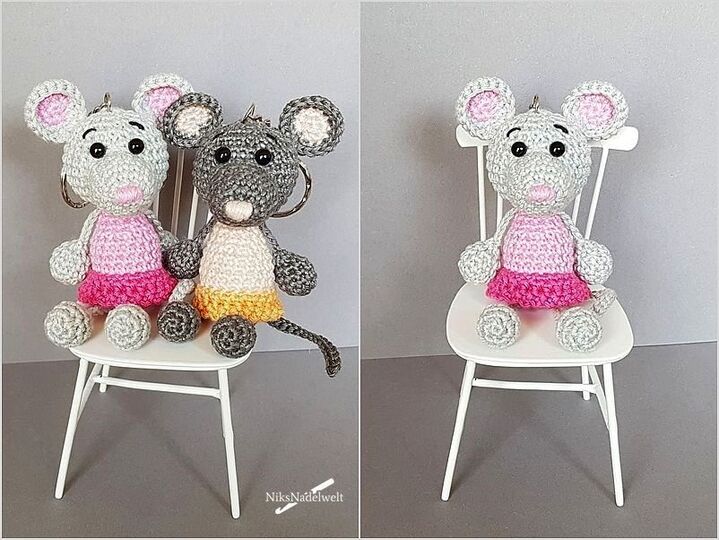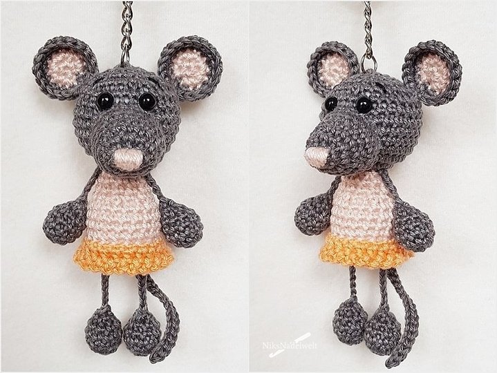 Das Mäuschen wird mit Baumwolle 50g/125m gehäkelt. Es wird nicht viel Wolle benötigt (die genauen Angaben stehen in der Anleitung), so dass auch sehr gut Wollreste verbraucht werden können. Es werden 2x 6mm Sicherheitsaugen benötigt, nach Bedarf ein Schlüsselanhänger.