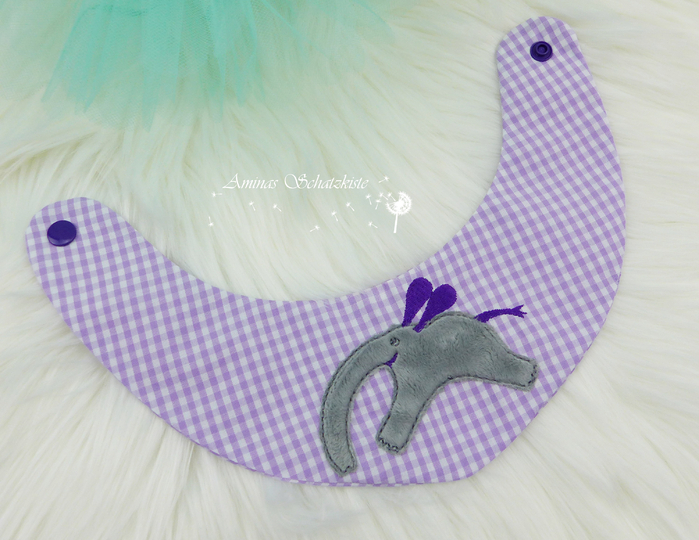 Halstuch für die Stickmaschine. Nur eine kleine Wendeöffnung wird zum Schluss mit der Hand oder der Nähmaschine geschlossen. Halsumfang ca. 30 cm, je nach Position des Druckknopfes. Größe der Applikation: 10,5 cm x 6,5 cm.