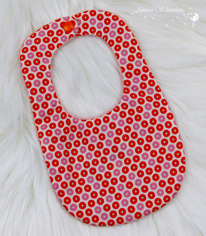 Lätzchen für die Stickmaschine. Nur eine kleine Wendeöffnung wird zum Schluss mit der Hand oder der Nähmaschine geschlossen. Halsumfang ca. 30 cm, je nach Position des Druckknopfes. Größe der Applikation: 10,2 cm x 7,7 cm.