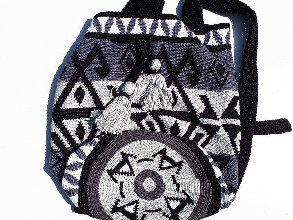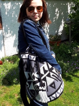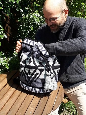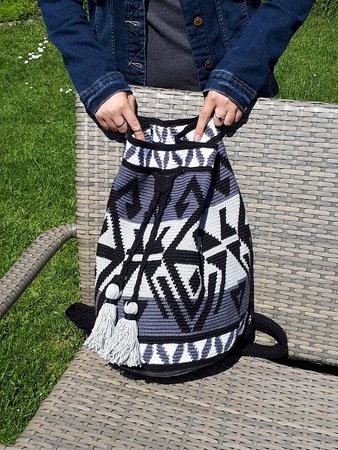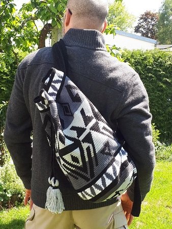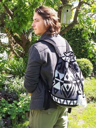 Hier habe ich wieder ein absolut einzigartiges Produkt für den modebewussten Liebhaber von Handarbeit. Man nennt diesen Stil Mochila. Das Muster und die Farben sind so gewählt, dass der Rucksack für Sie und Ihn gleichermaßen mit Stolz getragen werden kann :-)