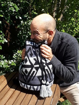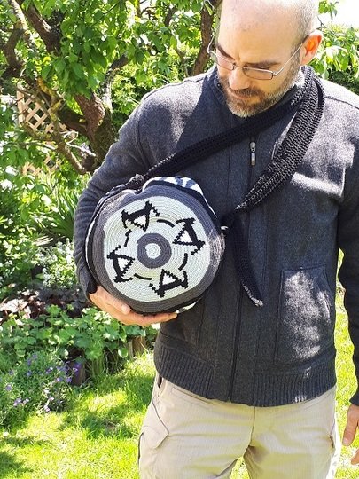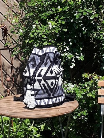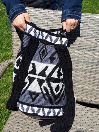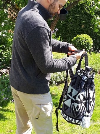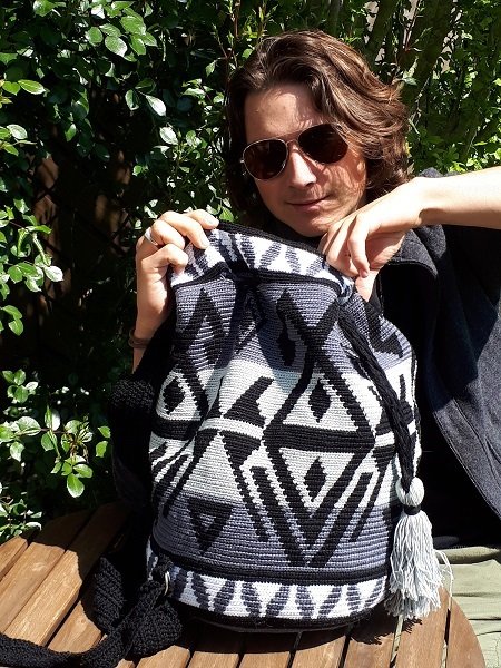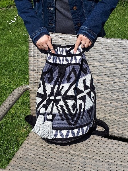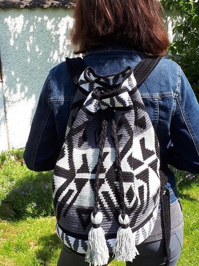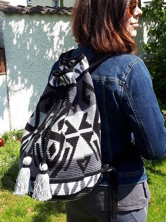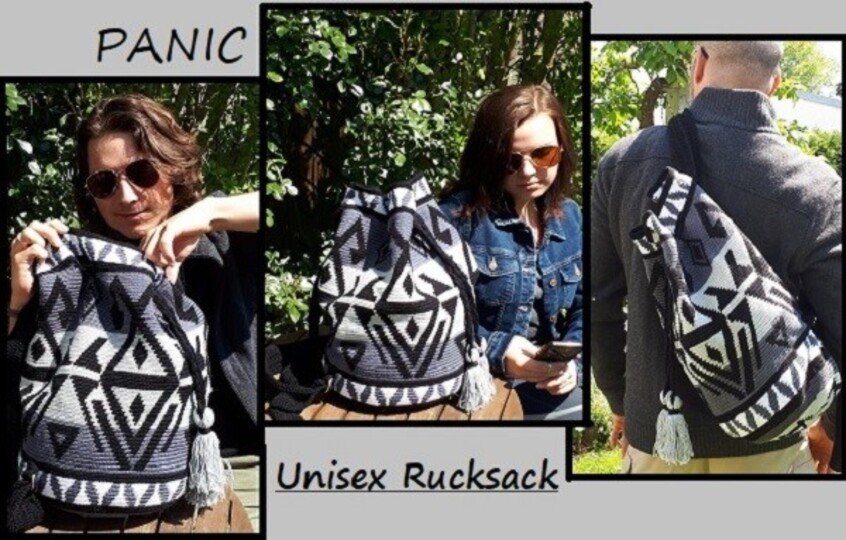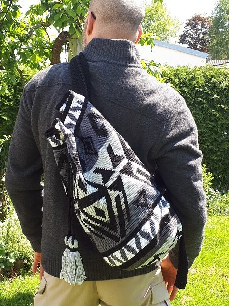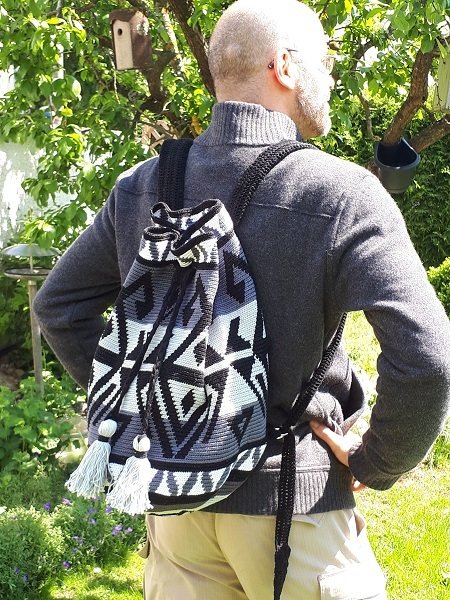 Hier habe ich wieder ein absolut einzigartiges Produkt für den modebewussten Liebhaber von Handarbeit. Man nennt diesen Stil Mochila. Das Muster und die Farben sind so gewählt, dass der Rucksack für Sie und Ihn gleichermaßen mit Stolz getragen werden kann :-)