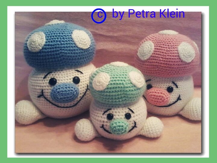Diese Anleitung ist 14 Seiten lang und beinhaltet eine Materialliste sowie ein Zeichenerklärungsblatt. Sie ist liebevoll von Hand geschrieben und mit erklärenden Zeichnungen versehen. Die Mama Pilz und der Sprössling sind mit einer 2,5er Häkelnadel gearbeitet und haben eine Höhe von von 14 cm bzw. 10 cm, Papa Pilz habe ich mit einer 3,0er Häkelnadel gearbeitet und dieser hat bei mir eine Höhe von 15,5 cm . Da die Pilze nur mit festen Maschen gearbeitet wurden, sind sie auch Anfänger geeignet.