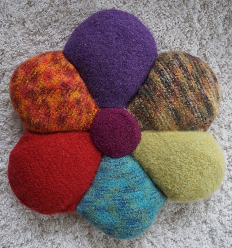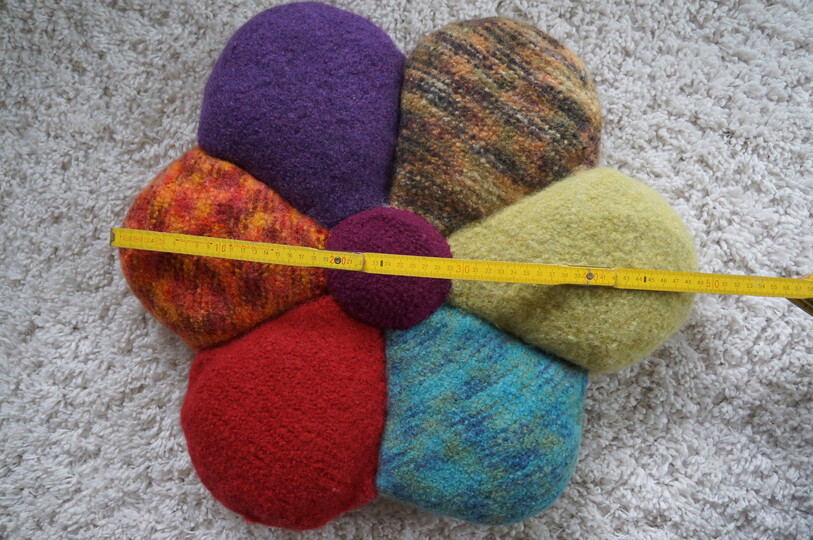 Die Filzblume hat im fertigen Zustand einen Durchmesser von ca. 50cm. Sie eignet sich als Sofa- oder Sitzkissen. Auch kleine Vierbeiner können sich darauf entspannen.