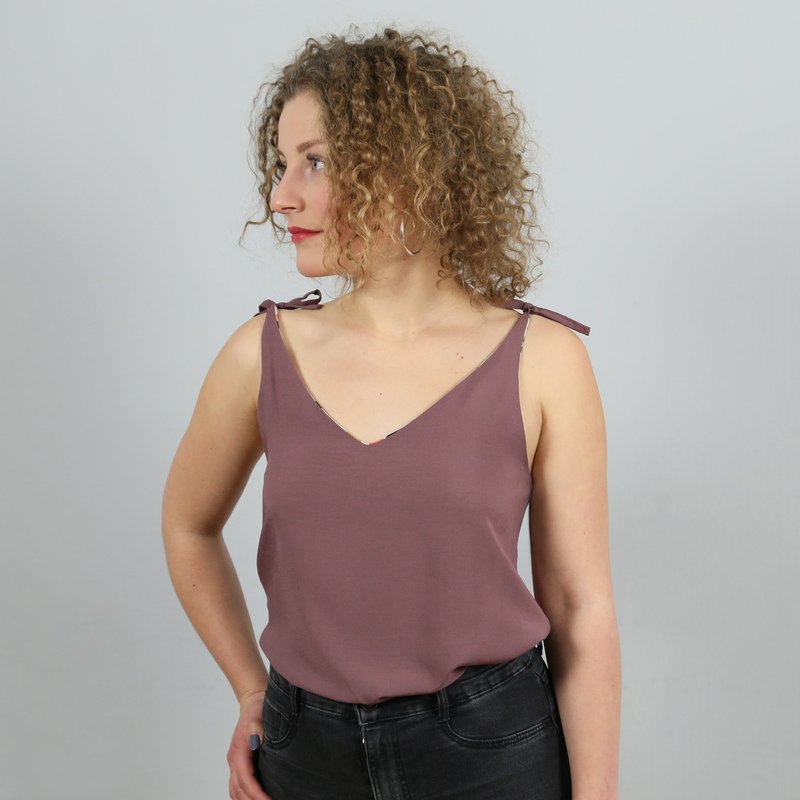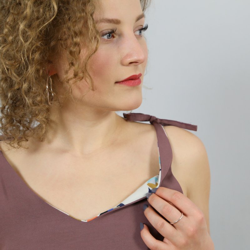 FRAU MAYA ist ein klassisches Sommertop für fließende Stoffe. Ein V-Ausschnitt ziert Vorder- und Rückenteil, die zarten Bindebändchen werden zwischen Außenstoff und Beleg eingenäht und in der Wunschlänge geknotet. Ein Schlitz in der Seitennaht lässt das Top locker die Hüften umspielen.