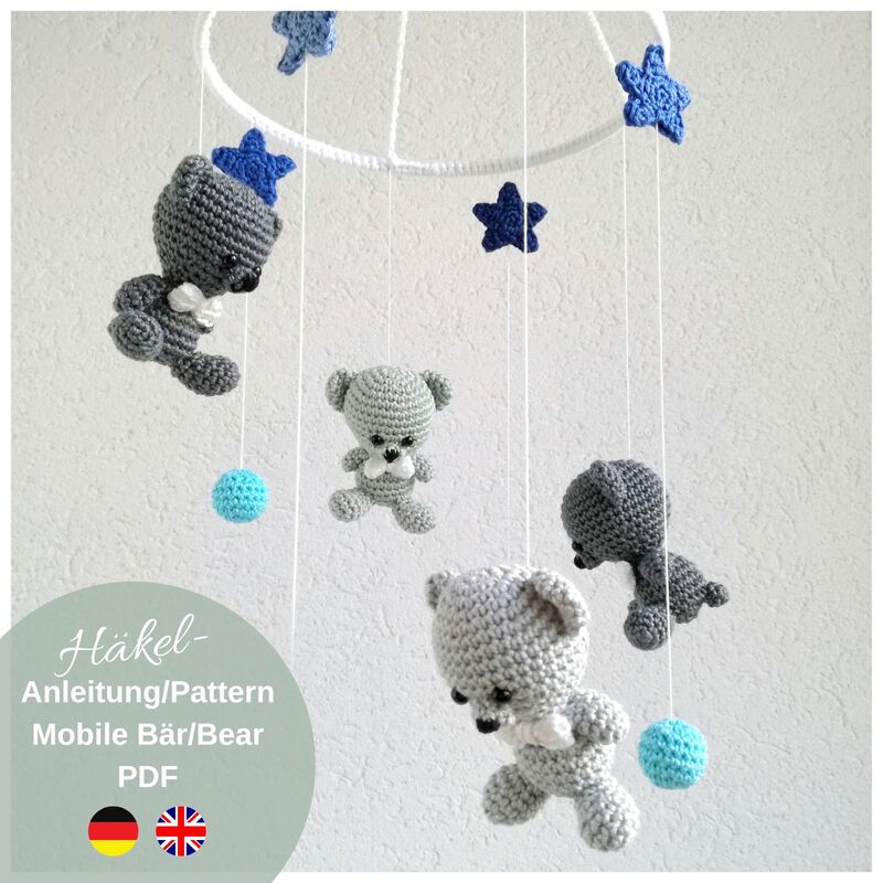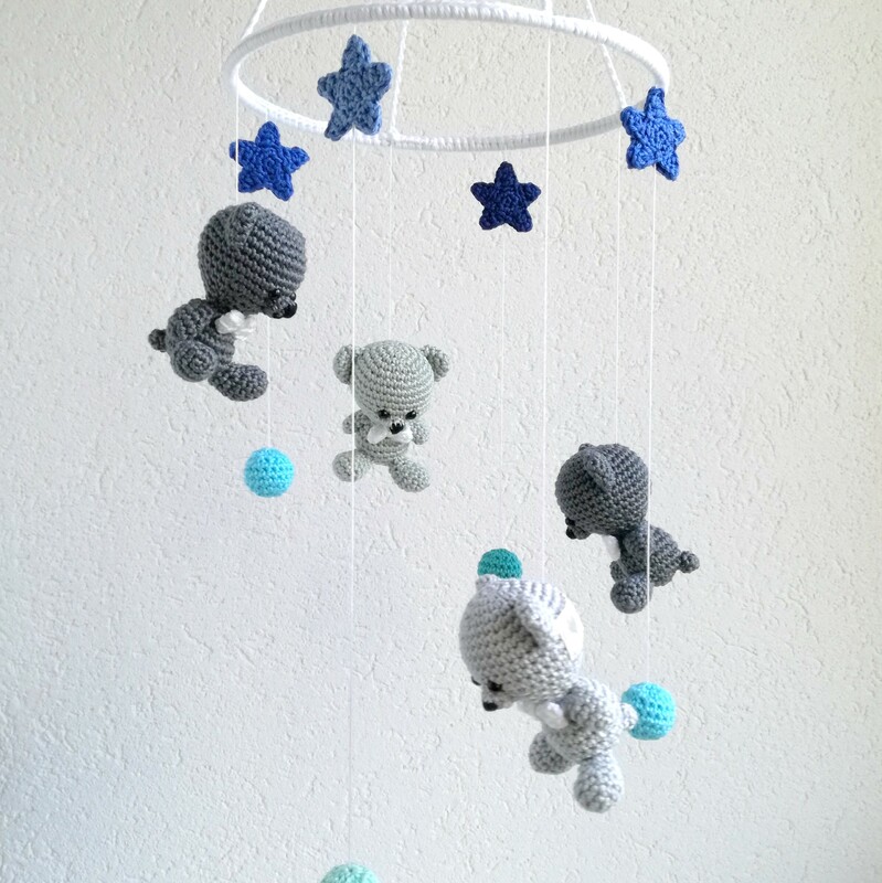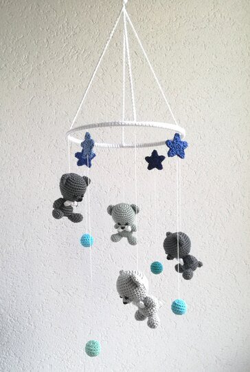 Ein gehäkeltes Babymobile mit Bären und Sternen ist das perfekte Geburtsgeschenk um die Einrichtung im Babyzimmer abzurunden.