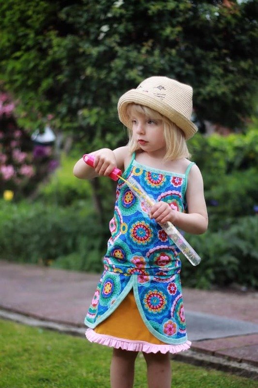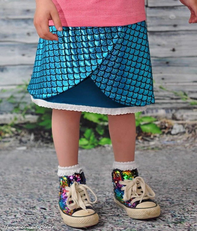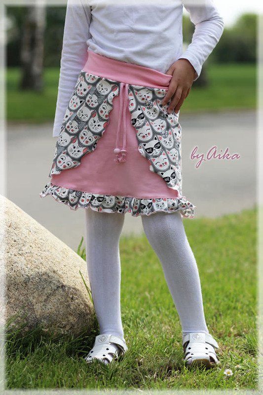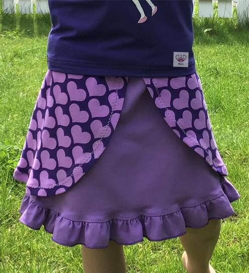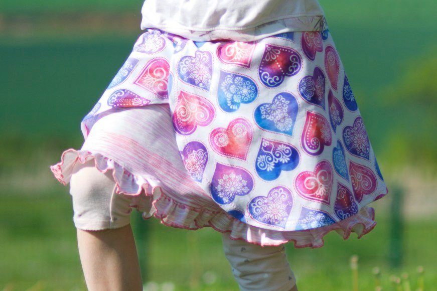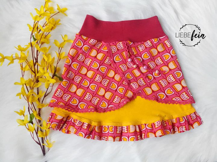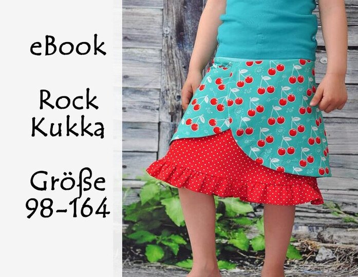 Kukka (finnisch: Blume) ist ein Sommer-Rock für alle Mädels in Größe 98 bis 164. Du kannst ihn in verschiedenen Varianten nähen: einfach oder mehrlagig, mit Rüsche, mit breiten oder schmalen "Klappen". Der Schnitt eignet sich hervorragend für Jersey und darf in keinem Kleiderschrank fehlen!