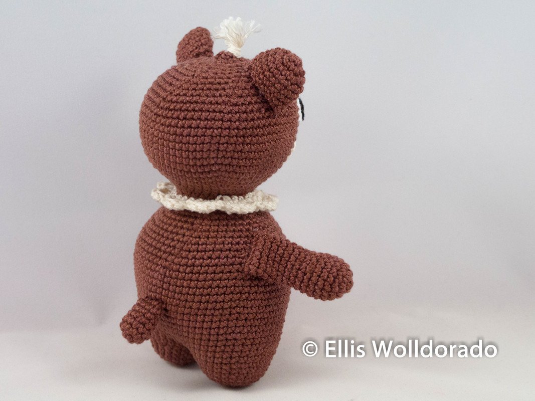 Mit einem Baumwollgarn (Lauflänge 125 m / 50 g) wie z. B. Catania von Schachenmayr, Cotton Quick von Gründl, Miami von RedHeart oder Carina Baumwolle und einer Häkelnadel Nr. 3 wird Bruno ca. 16 cm groß.