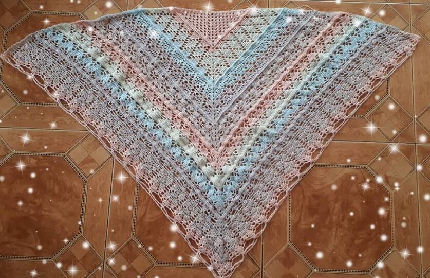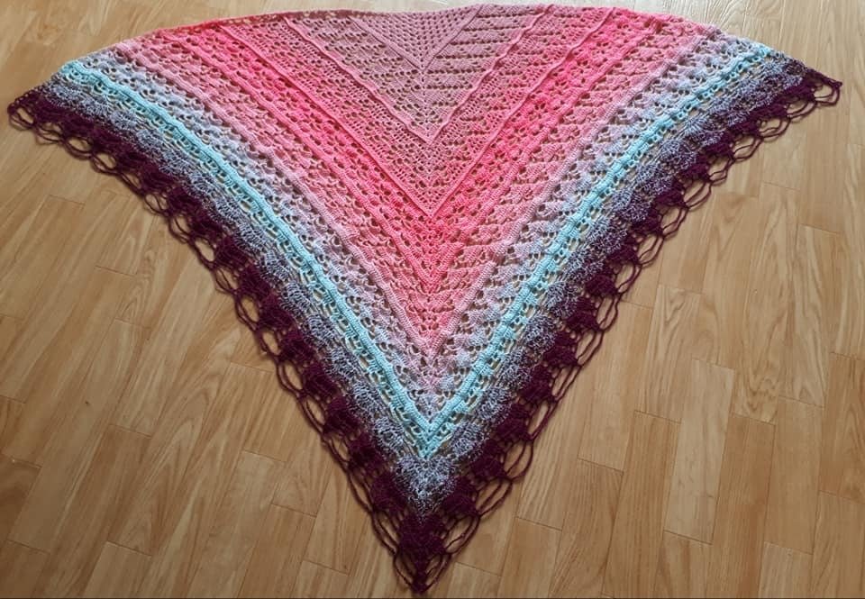 Die Anleitung geht bis Reihe 72. (in schriftlicher Form) Die Häkelschrift ist jeweils bis zur Mitte des Tuches, welche dann spiegelverkehrt zurück gearbeitet wird.